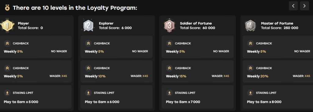 - Platinum Card: Den ultimata nivån. Här får du 10% daglig cashback utan krav och 50% weekly cashback, plus en personlig VIP-manager tillgänglig dygnet runt.