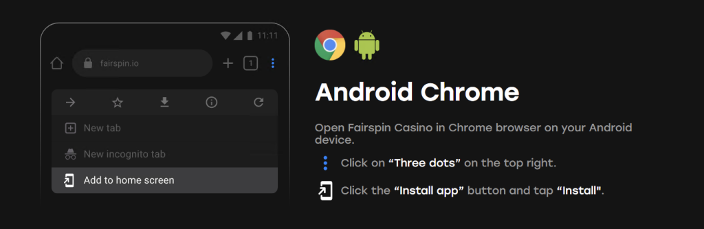 Nej, du behöver inte ladda ner nÄgra osÀkra .apk-filer frÄn externa kÀllor. Genom att anvÀnda PWA-tekniken installeras Fairspin app direkt via din sÀkra Chrome-webblÀsare. Detta Àr bÄde sÀkrare och enklare Àn att manuellt installera app-filer.
